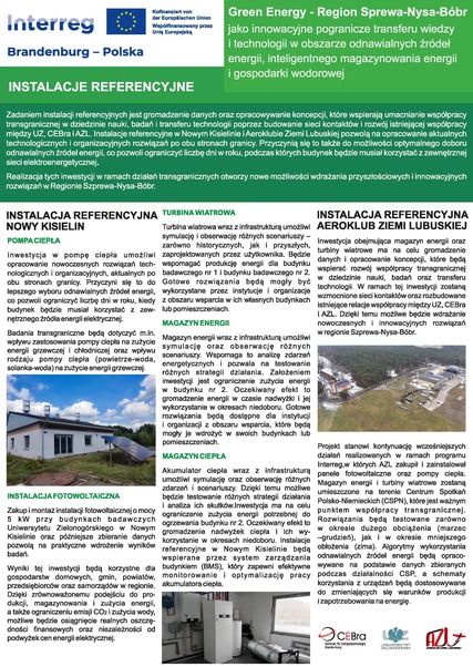 Die Aufgabe der Referenzanlagen besteht darin, Daten zu sammeln und Konzepte zu entwickeln, die die Stärkung der grenzüberschreitenden Zusammenarbeit im Bereich Wissenschaft, Forschung und Technologietransfer durch vernetzende Maßnahmen sowie die Ausweitung bestehender Kontakte im Rahmen der grenzüberschreitenden Kooperation von UZ, CEBra und AZL unterstützen. Die Referenzanlage in Nowy Kisielin ermöglicht die Entwicklung aktueller technologischer und organisatorischer Lösungen auf beiden Seiten der Grenze und trägt dazu bei, die Auswahl erneuerbarer Energiequellen zu optimieren, um die Anzahl der Tage im Jahr zu reduzieren, an denen das Gebäude auf das externe Stromnetz angewiesen ist.